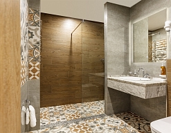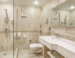 с душевой кабиной, туалетные принадлежности, фен