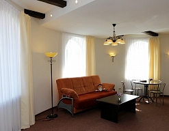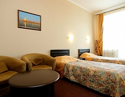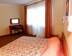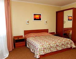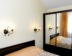 вешалка, зеркало, кресла, кровать двуспальная/ две полутороспальные кровати, прикроватные тумбочки, стол, столик журнальный, стул, шкаф