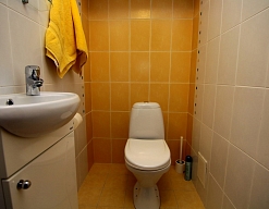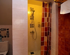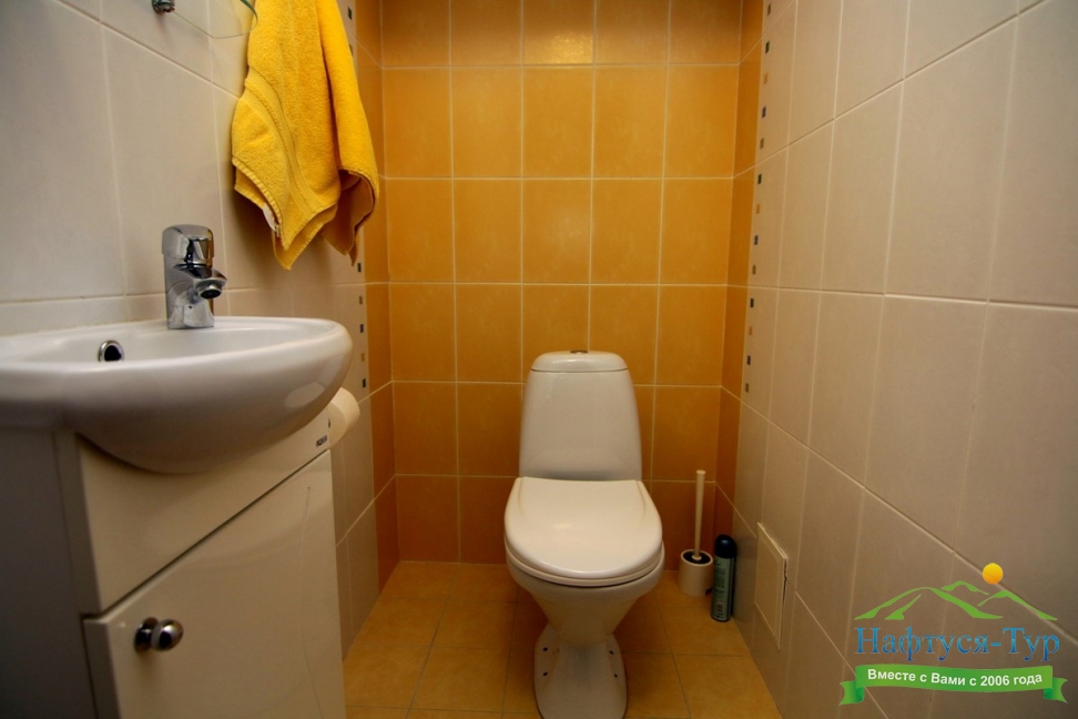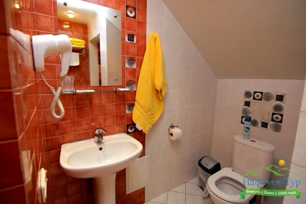 биде, с душевой кабиной, тапочки, туалетные принадлежности, фен, халат