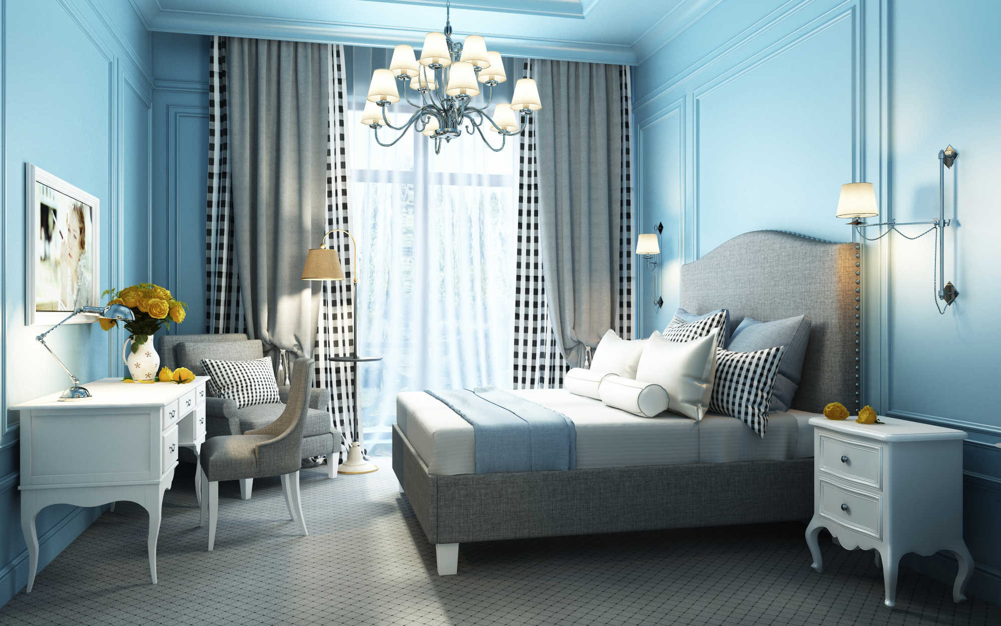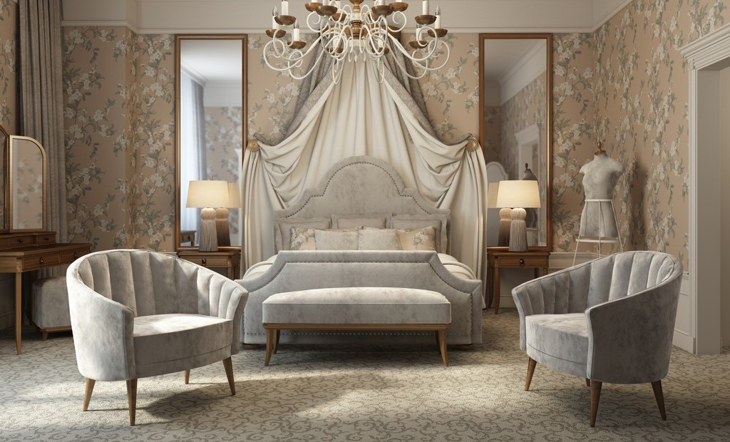 вешалка, зеркало, кровать двуспальная, прикроватные тумбочки, стол, стулья, шкаф