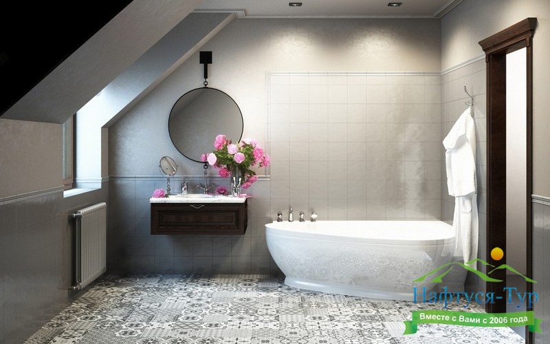 с ванной, тапочки, туалетные принадлежности, фен, халат