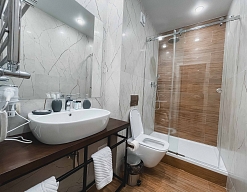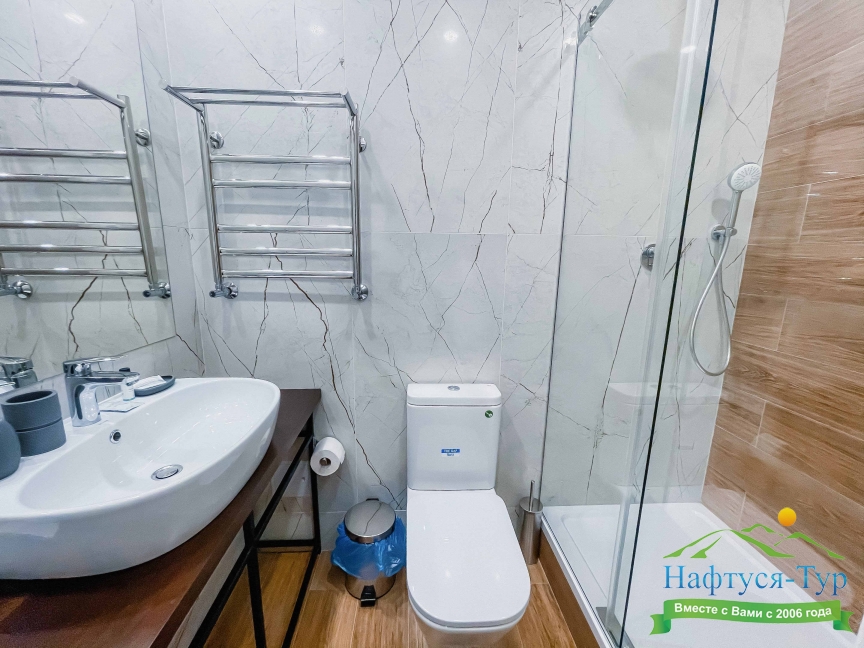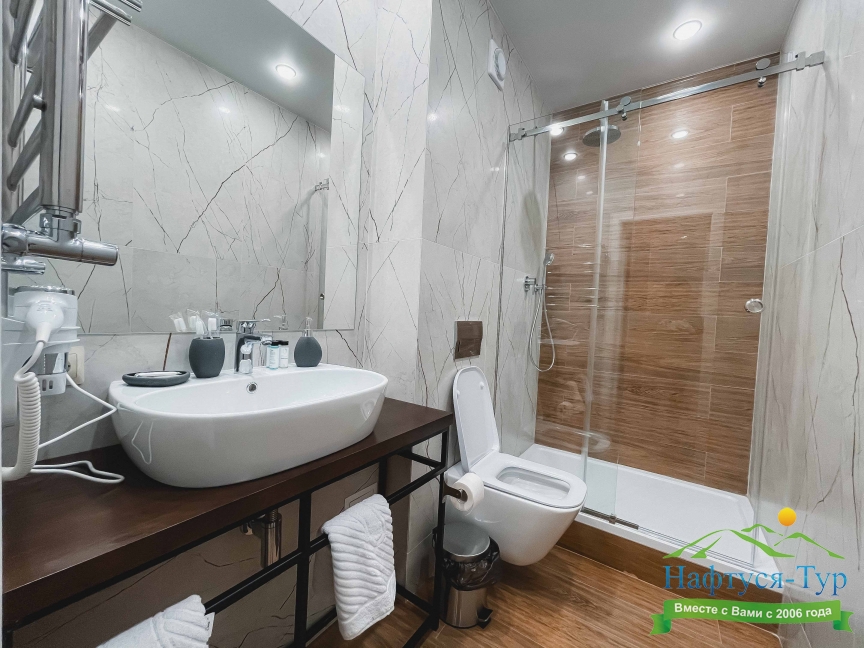биде, с душевой кабиной, тапочки, туалетные принадлежности, фен, халат