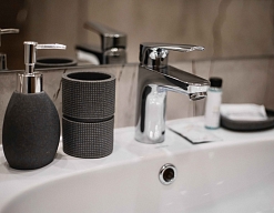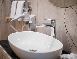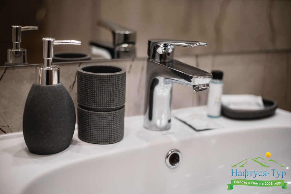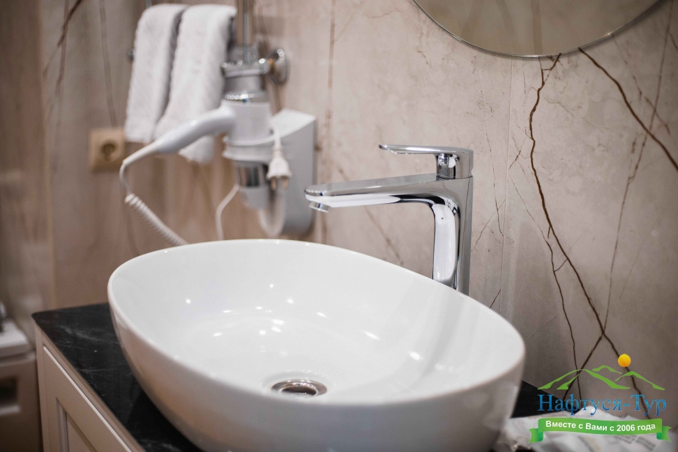 с душем, тапочки, туалетные принадлежности, фен, халат