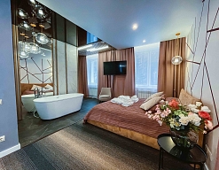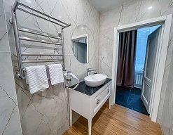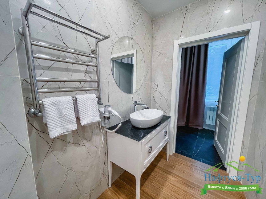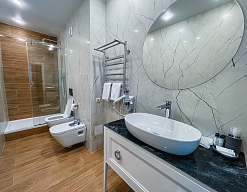 биде, с ванной и душевой кабиной, тапочки, туалетные принадлежности, фен, халат