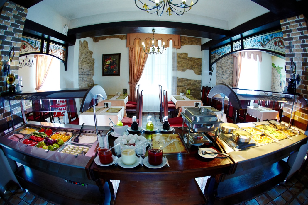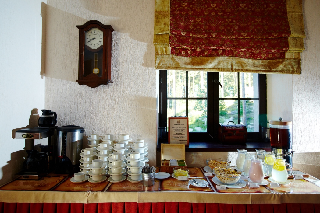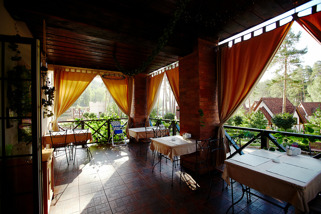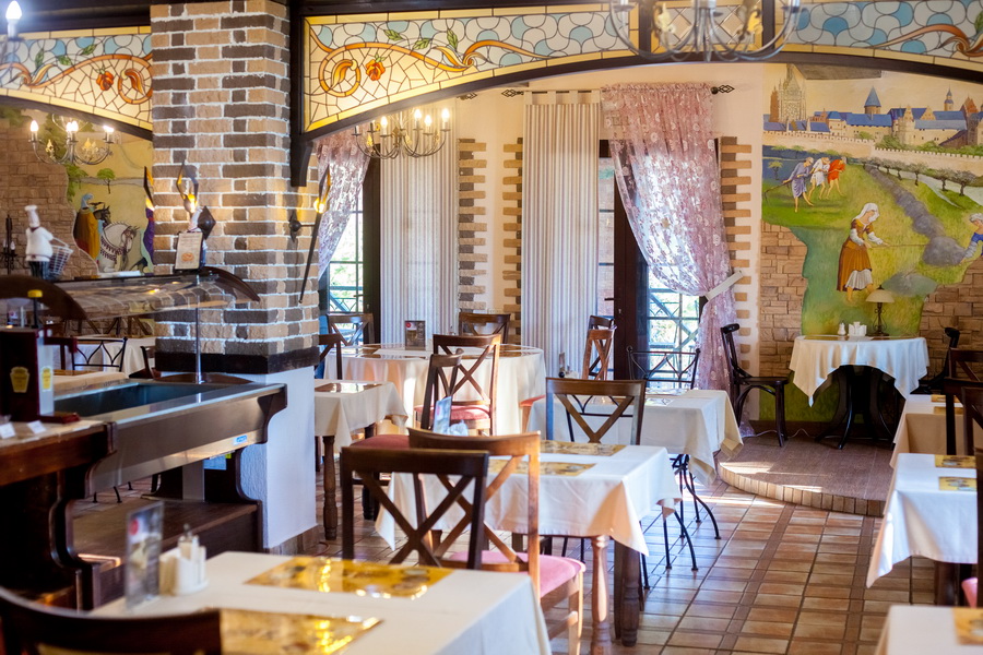 Ежедневно в основном обеденном зале сервируется питание по типу шведского стола. К услугам отдыхающих – ресторан «Алая роза», где гостей ждет оригинальное меню a la carte, большой выбор напитков и десертная карта. Время трапезы сопровождается ненавязчивым музыкальным оформлением – игрой рояля или саксофона. Каждую субботу – живой звук. Непринужденная уютная атмосфера царит в кафе «Ривьера» на берегу озера. Вместимость зала – до 25 человек. Формат заведения и меню рассчитаны на семейный отдых. Для проведения фуршетов предусмотрен дополнительный банкетный зал во французском стиле.