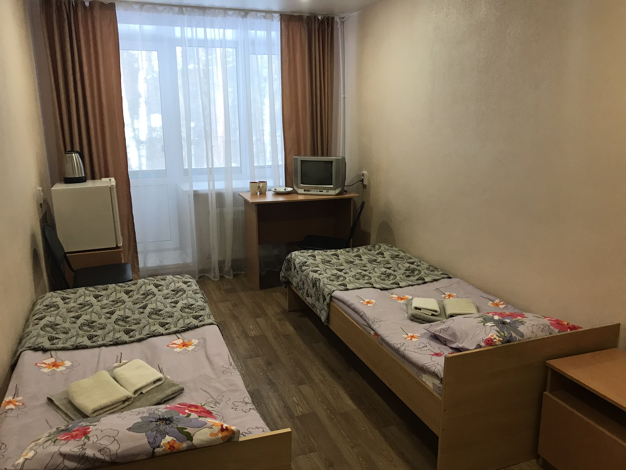 кровати односпальные, прикроватные тумбочки, стол, стулья, шкаф