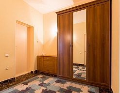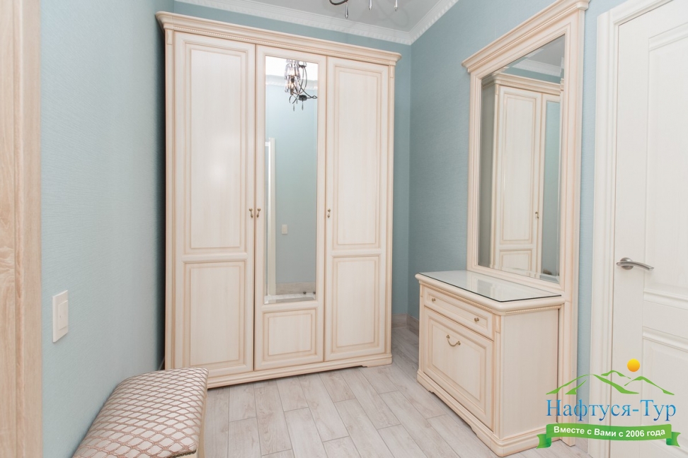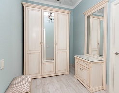вешалка, диван, зеркало, кровать двуспальная, прикроватные тумбочки, стол, стулья, шкаф