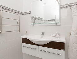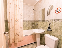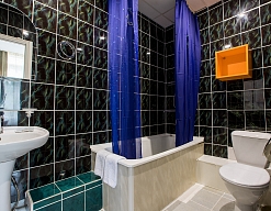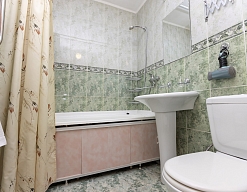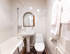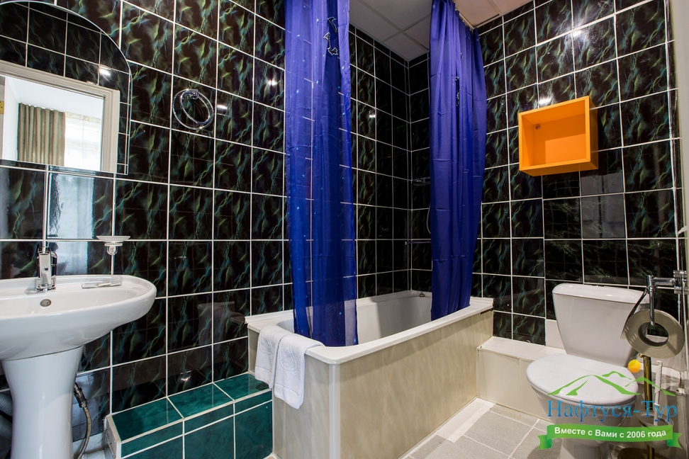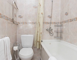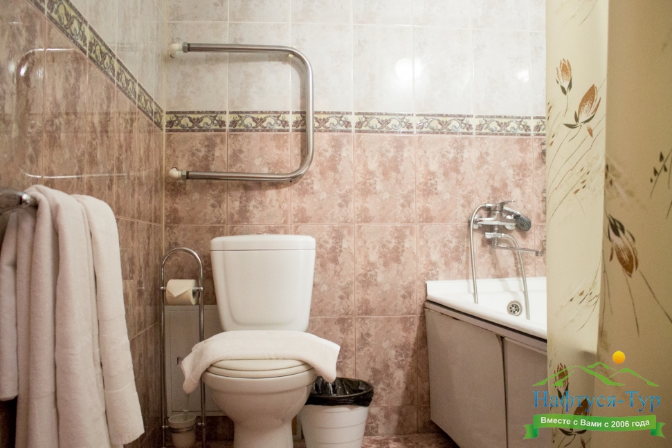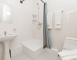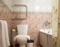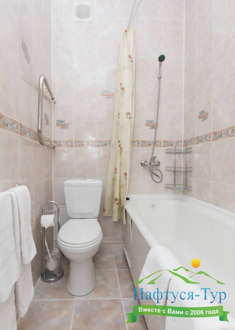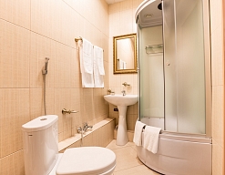 биде, с ванной, с душевой кабиной, тапочки, туалетные принадлежности, фен, халат