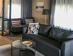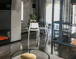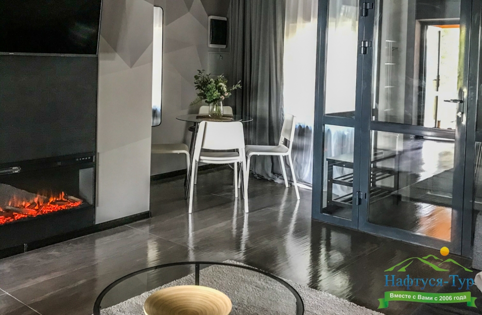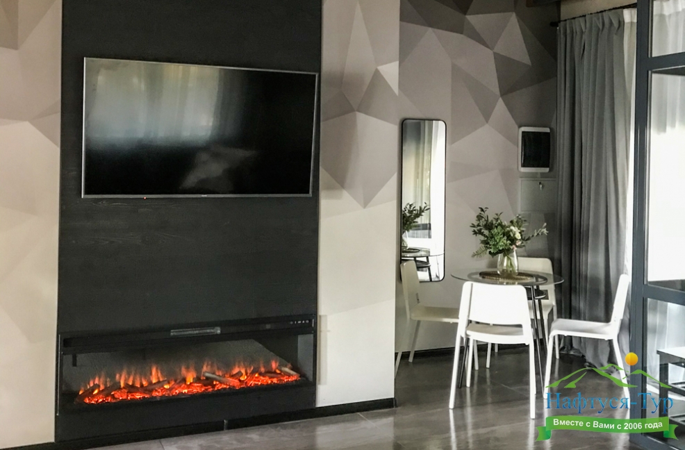 камин, мини-холодильник, телевизор, телефон, чайный набор посуды, электрочайник