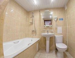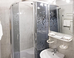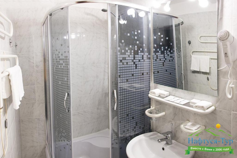 с душевой кабиной, тапочки, туалетные принадлежности, фен