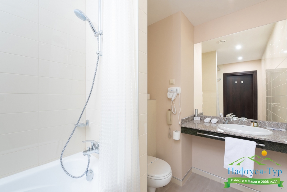 с душем, тапочки, туалетные принадлежности, фен, халат