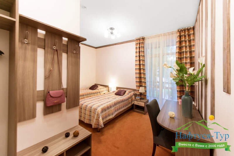 вешалка, зеркало, кровати односпальные, прикроватные тумбочки, столик туалетный, стул, шкаф