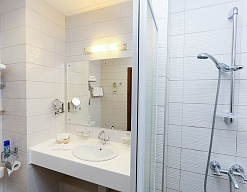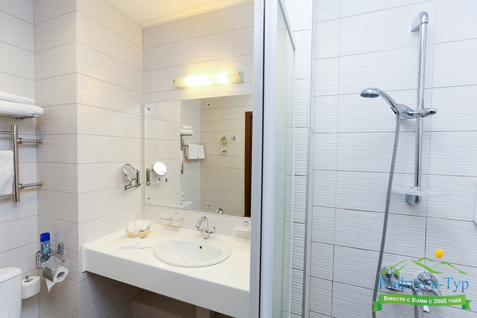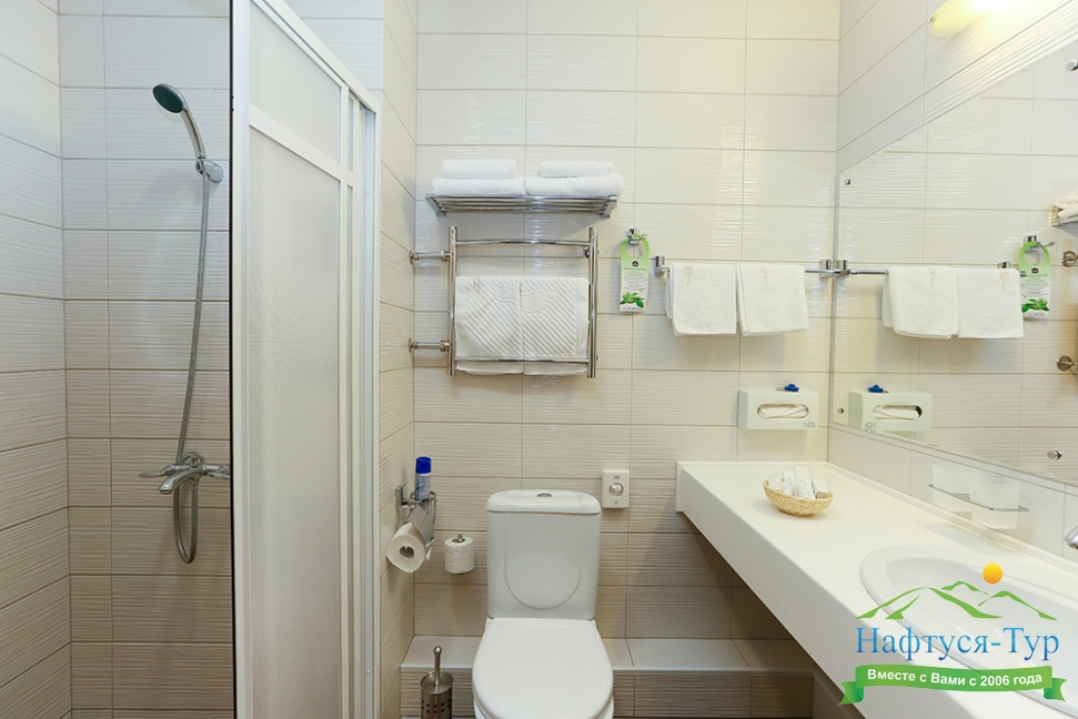 с душем, тапочки, туалетные принадлежности, фен, халат