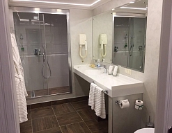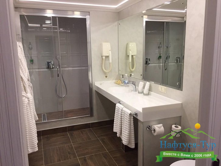 с душевой кабиной, тапочки, туалетные принадлежности, фен, халат