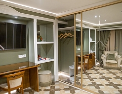 вешалка, зеркало, кресла, кровать двуспальная, прикроватные тумбочки, стол, столик журнальный, шкаф