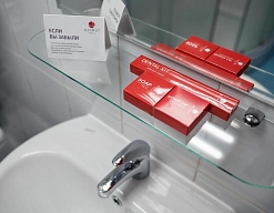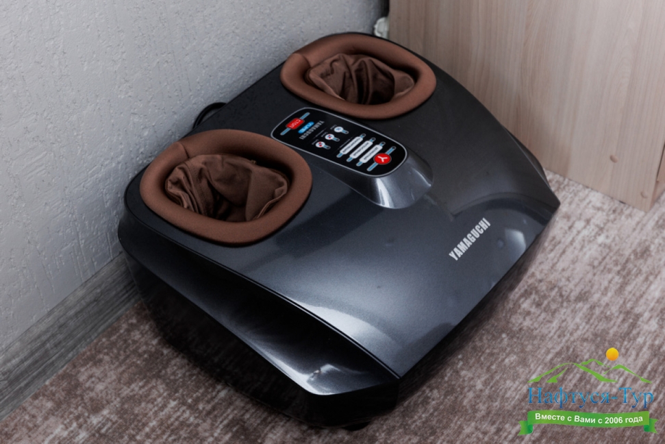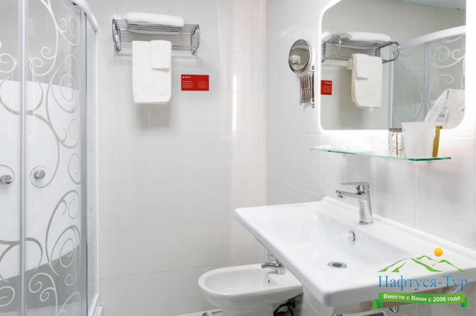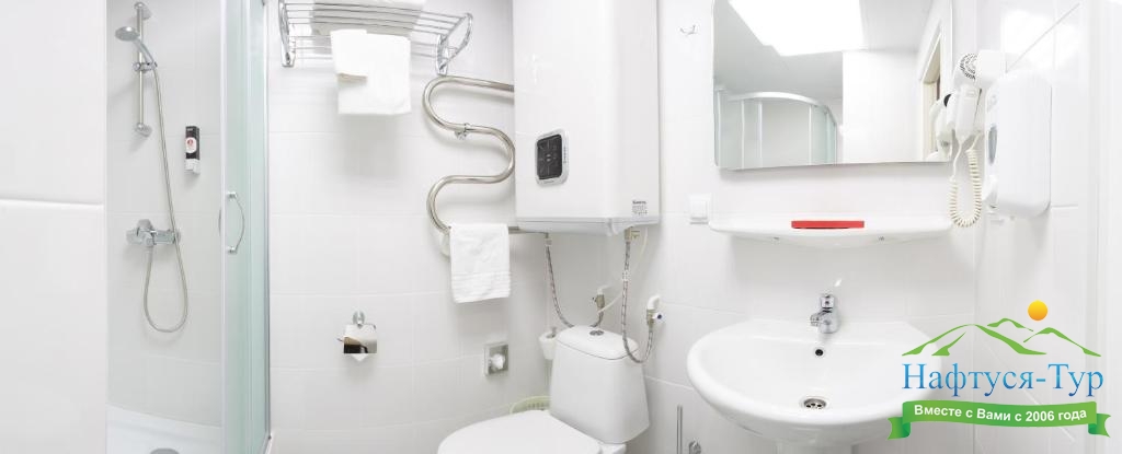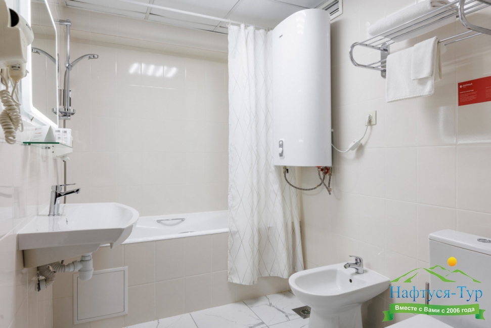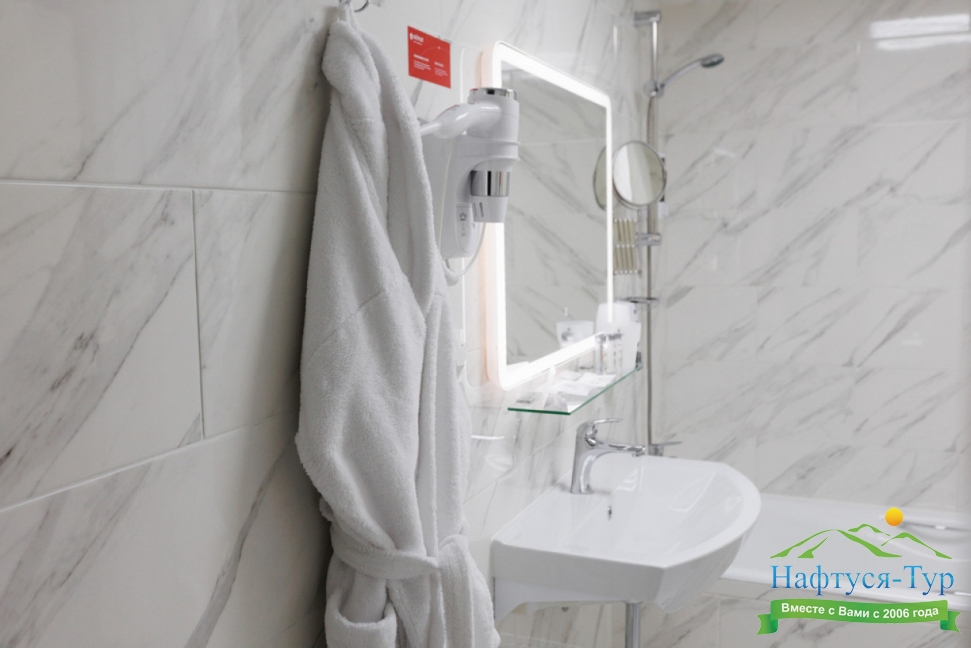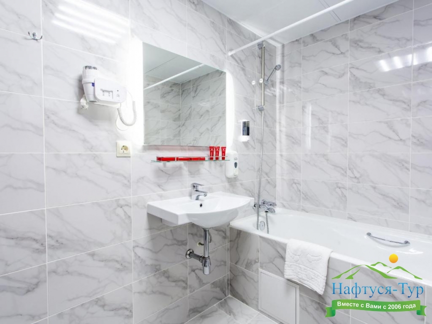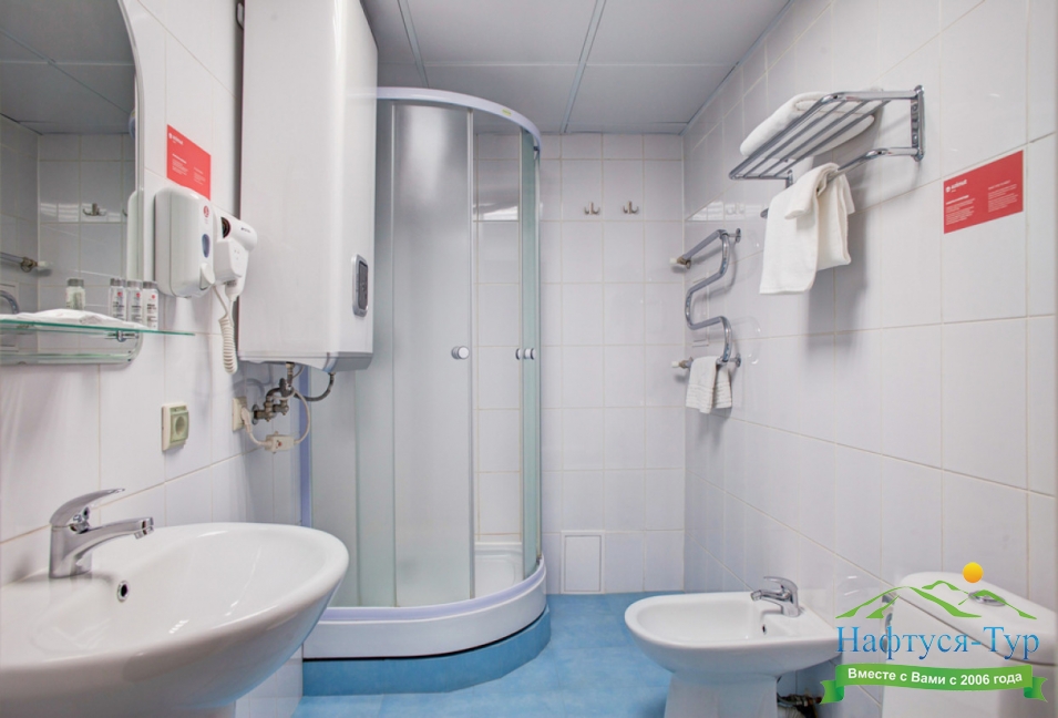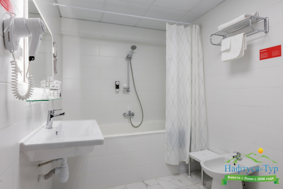с душем, тапочки, туалетные принадлежности, фен