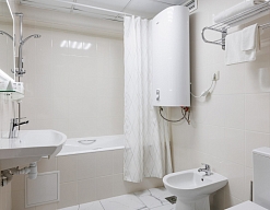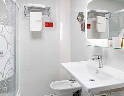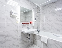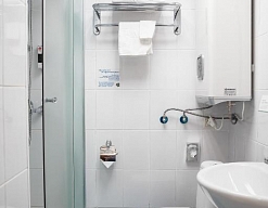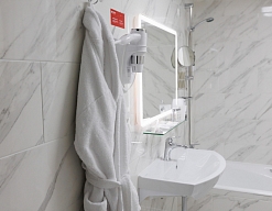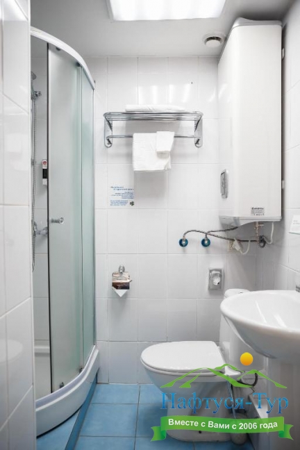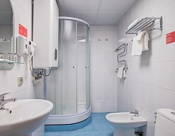 с душевой кабиной, тапочки, туалетные принадлежности, фен