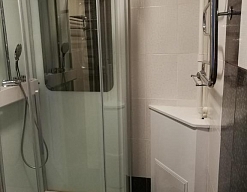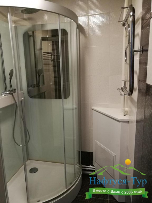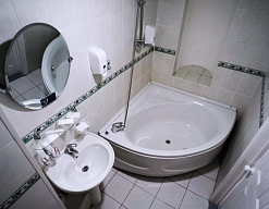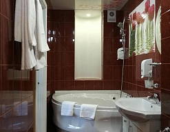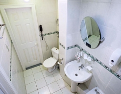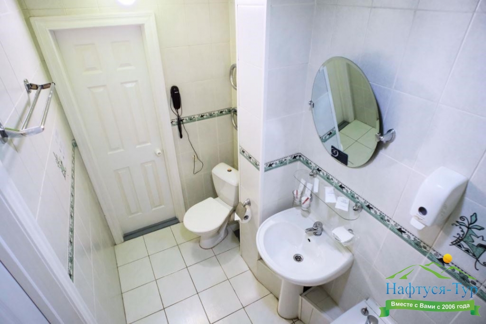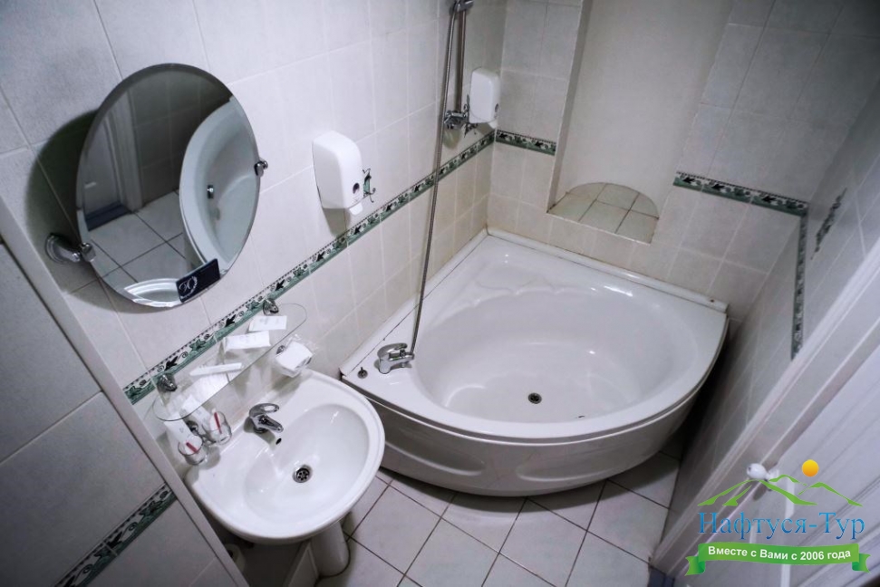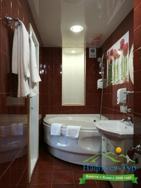с ванной или душевой кабиной, тапочки, туалетные принадлежности, фен, халат