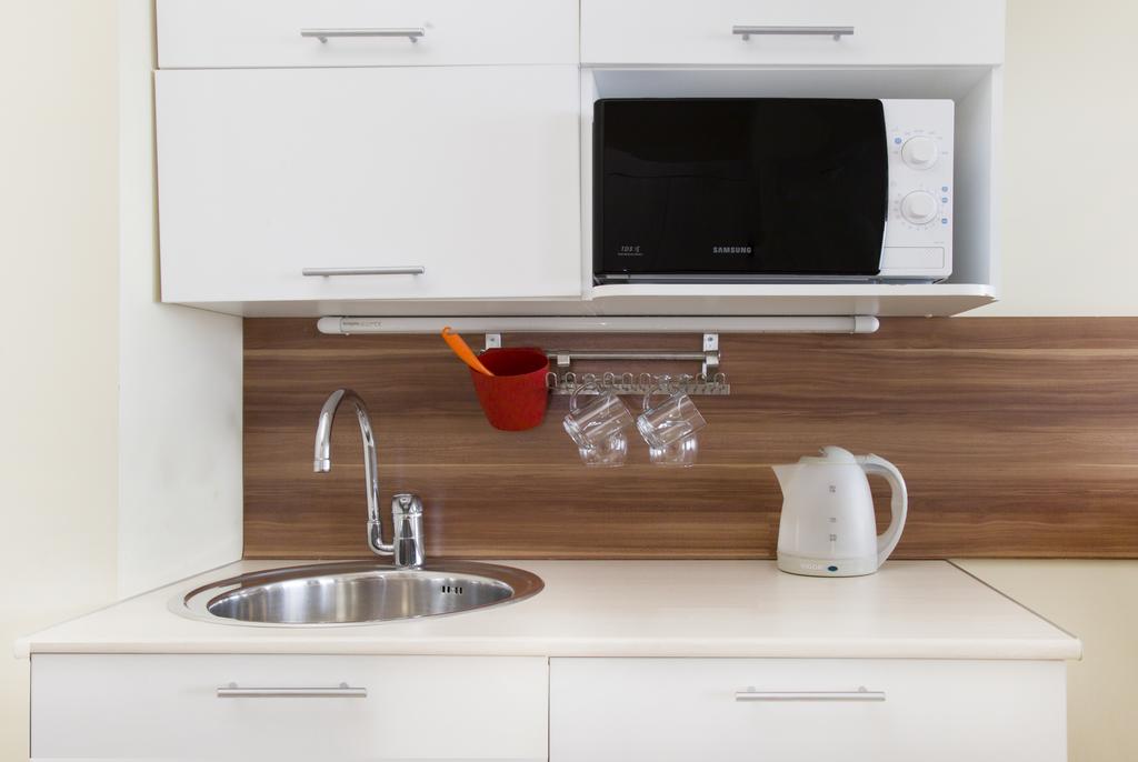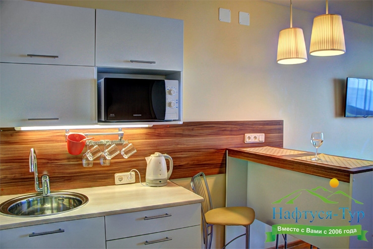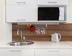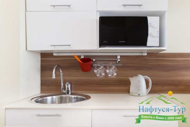 микроволновая печь, мини-холодильник, телевизор, чайный набор посуды, электрочайник