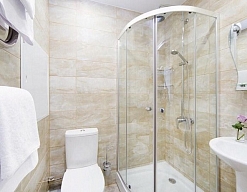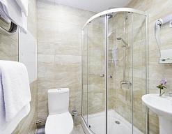 с душевой кабиной, туалетные принадлежности, фен
