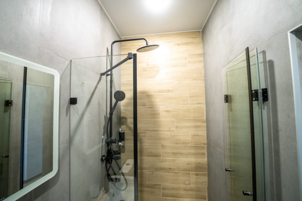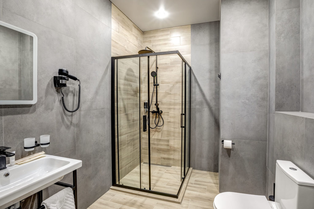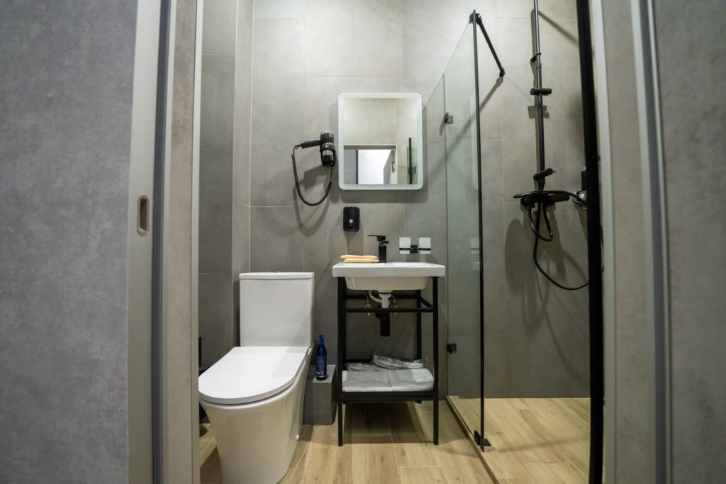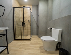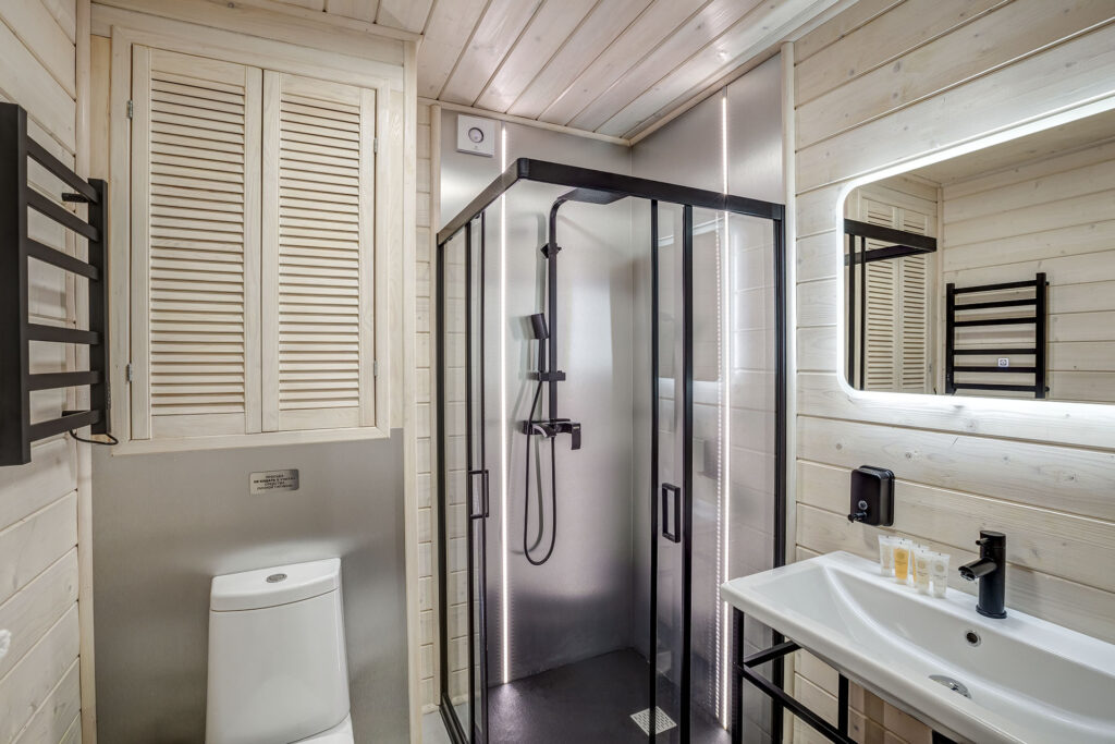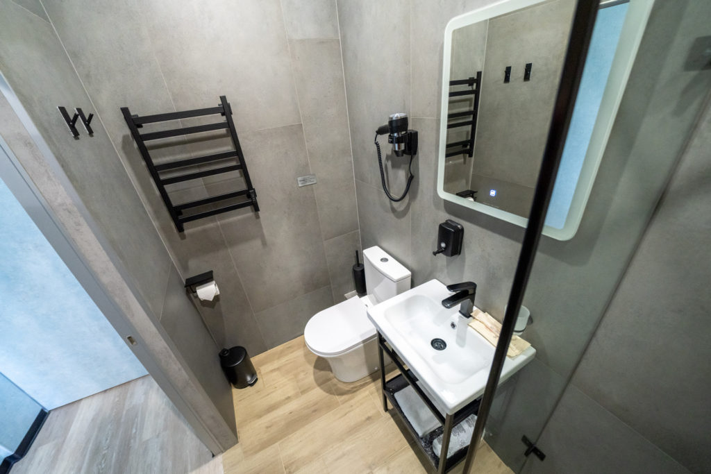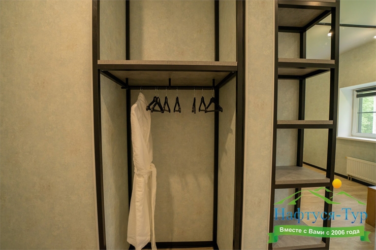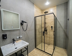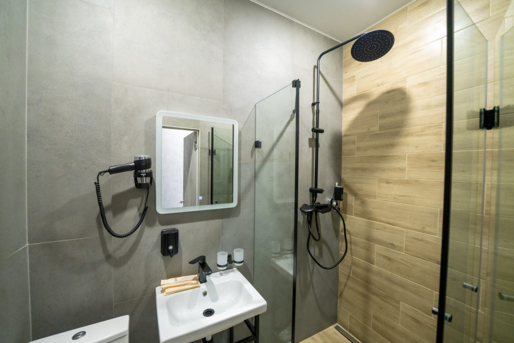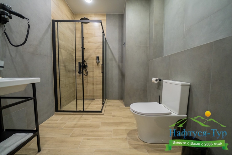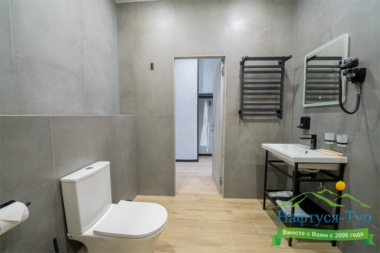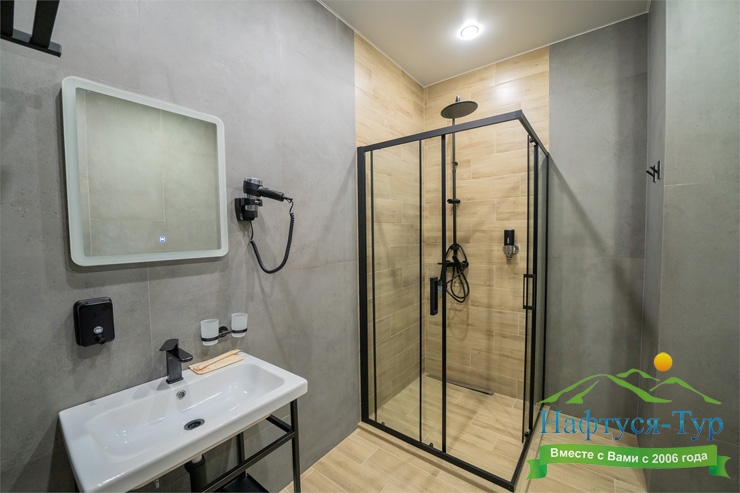 с душем, тапочки, туалетные принадлежности, фен, халат