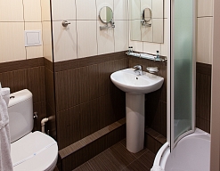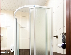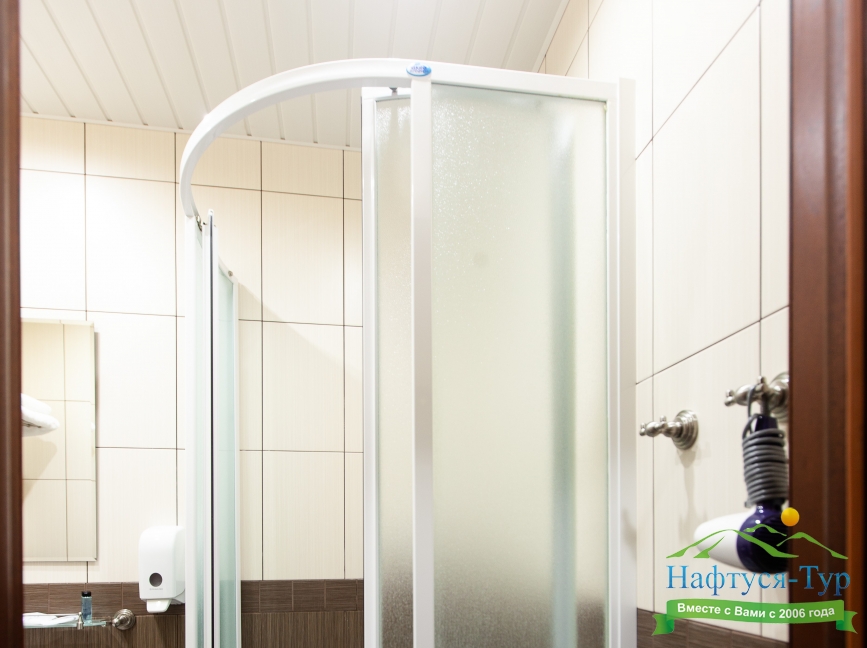 с душевой кабиной, тапочки, туалетные принадлежности, фен