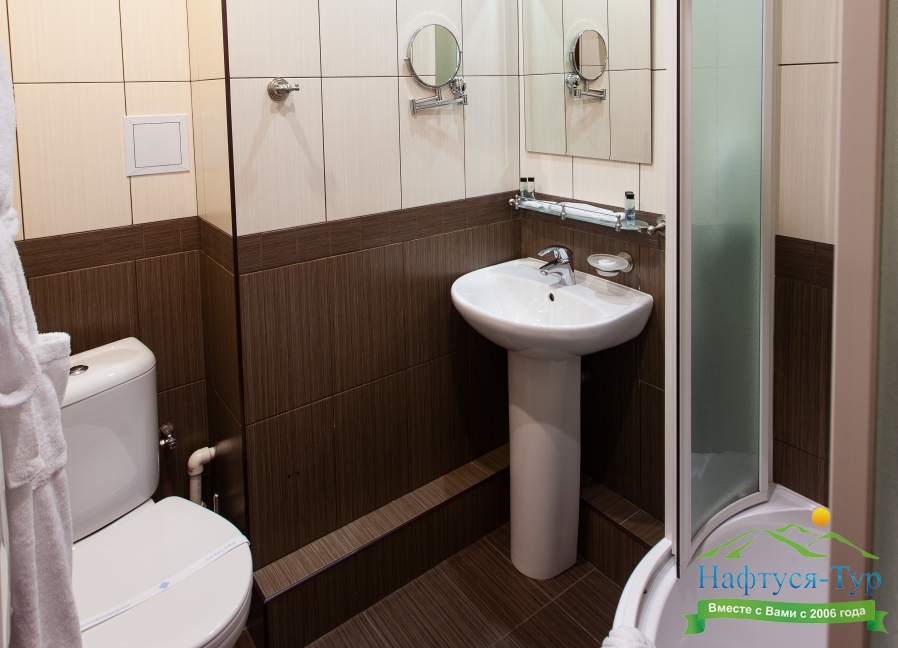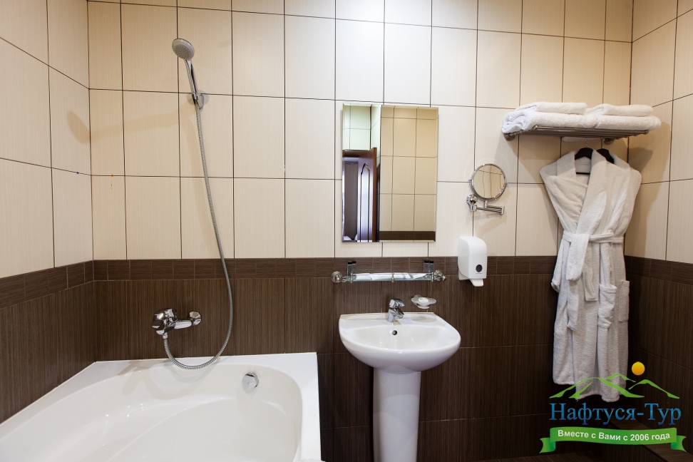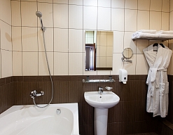 с ванной или душевой кабиной, тапочки, туалетные принадлежности, фен, халат