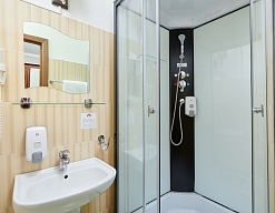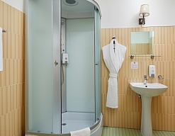 с душевой кабиной, тапочки, туалетные принадлежности, фен, халат