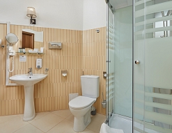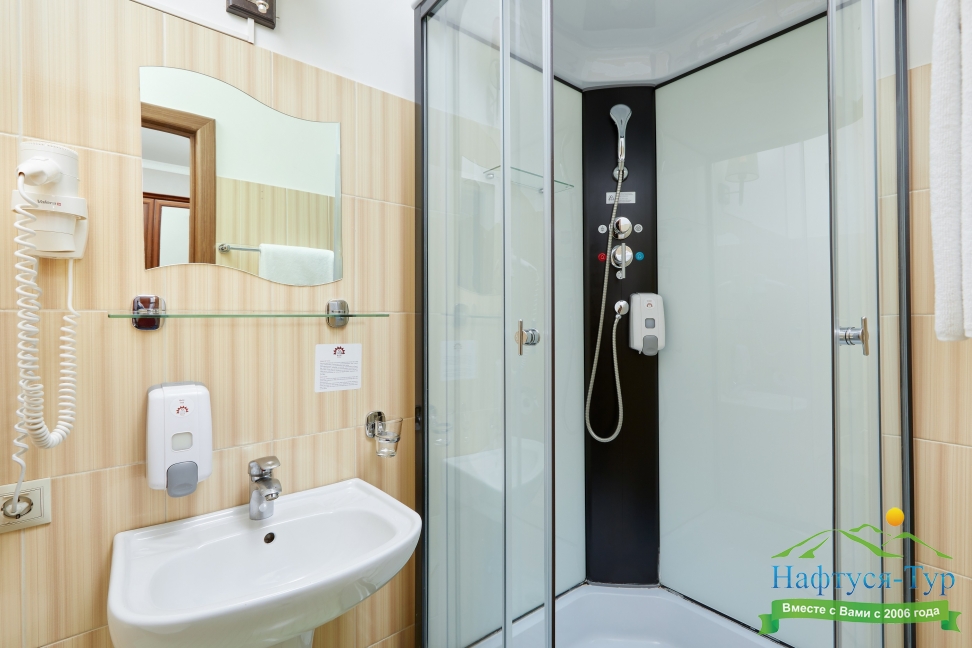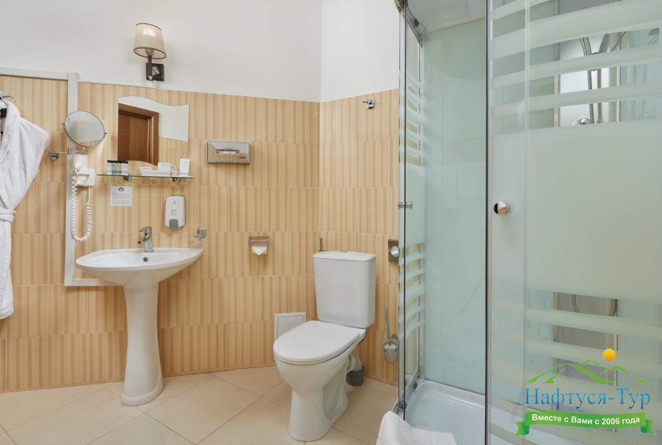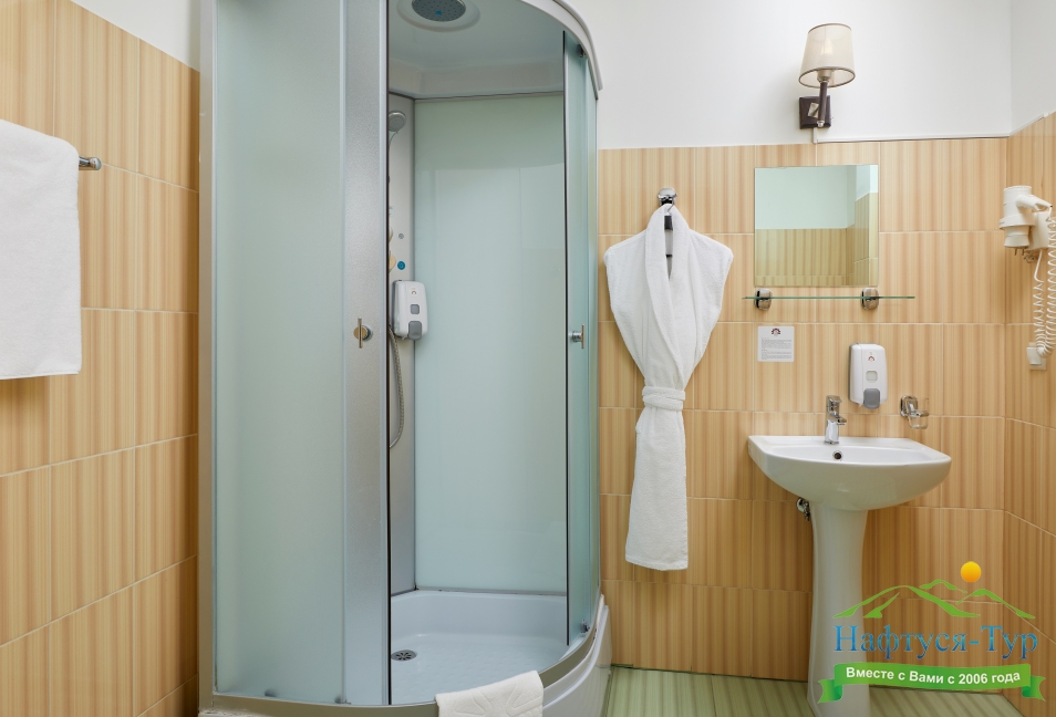 с душем, тапочки, туалетные принадлежности, фен, халат