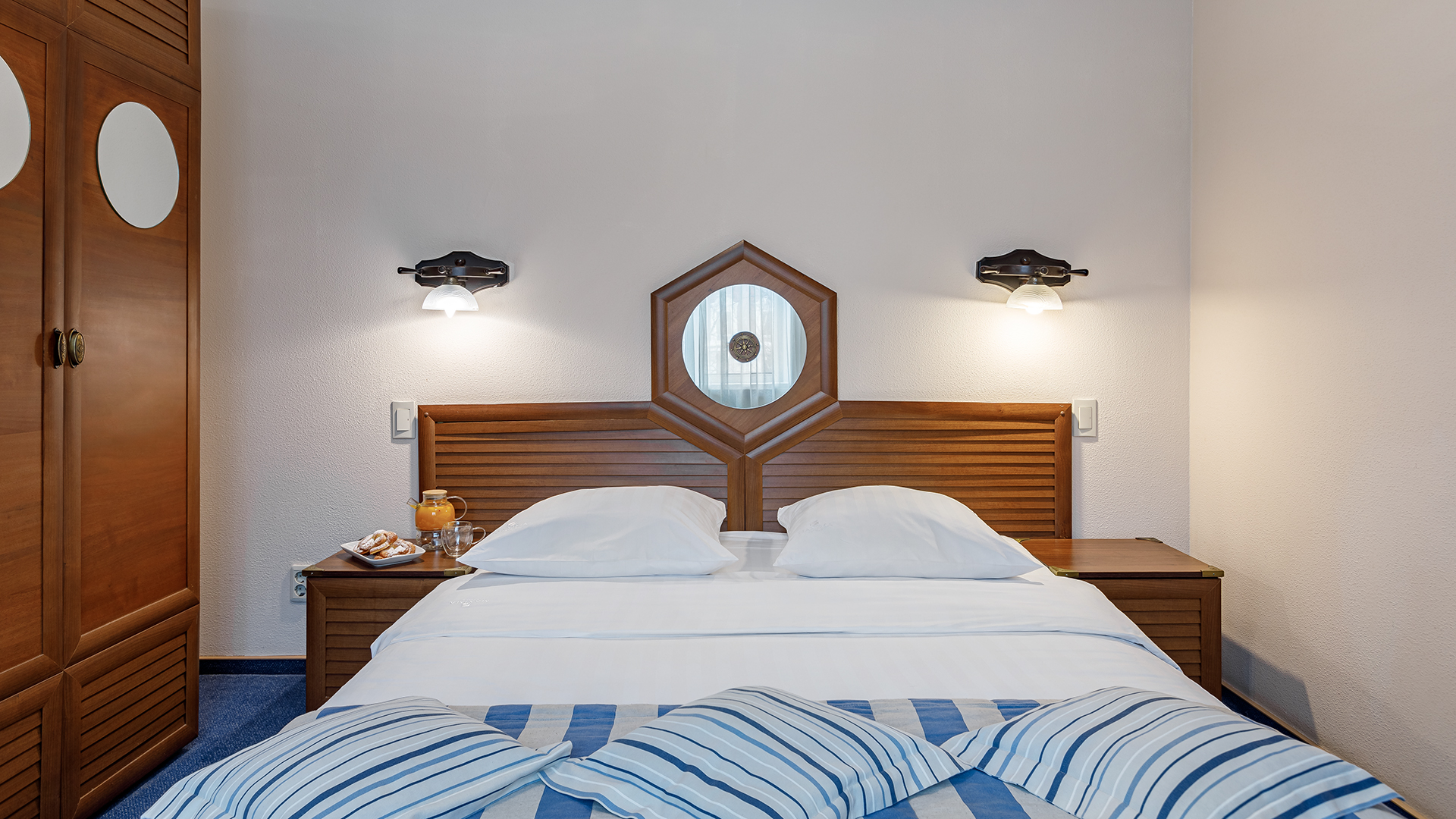 вешалка, зеркало, кровать двуспальная, прикроватные тумбочки, стол, стул, шкаф