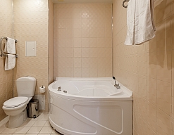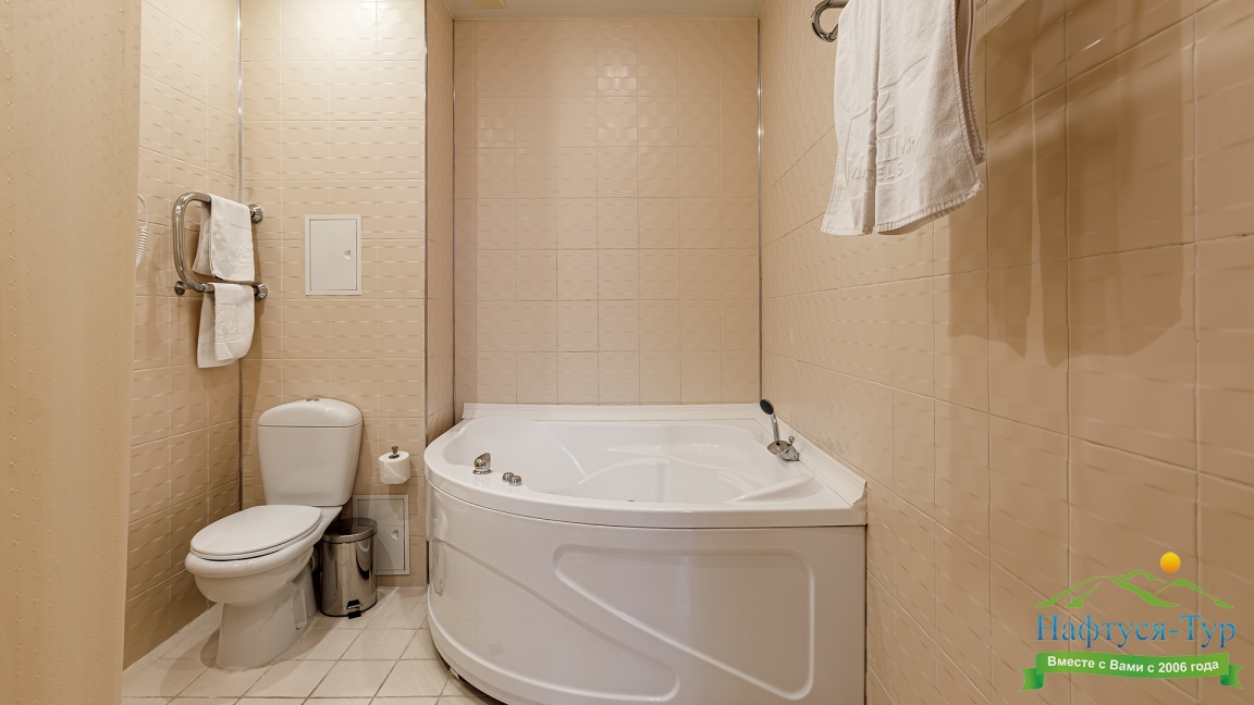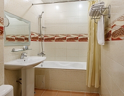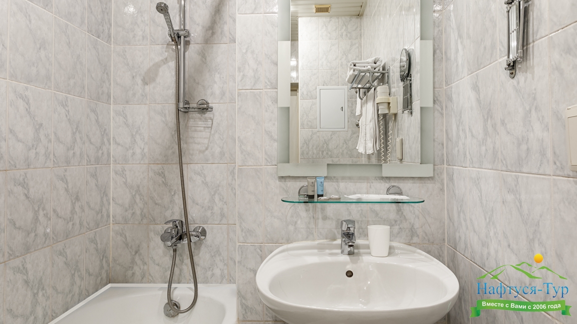 с ванной, тапочки, туалетные принадлежности, фен, халат