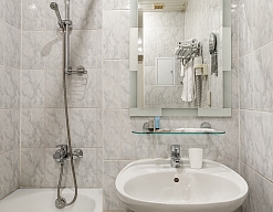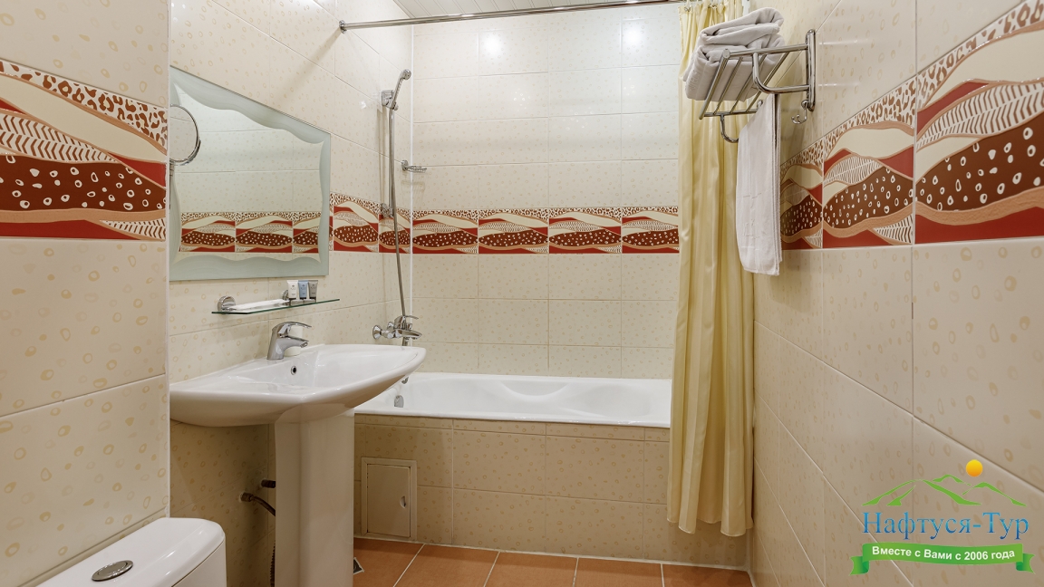 с ванной, тапочки, туалетные принадлежности, фен