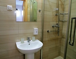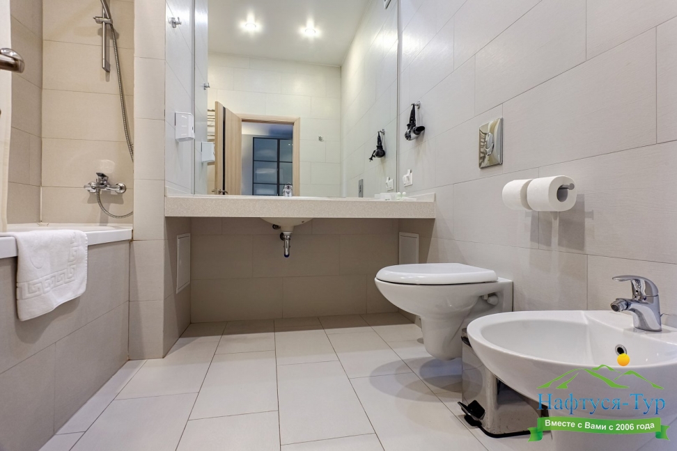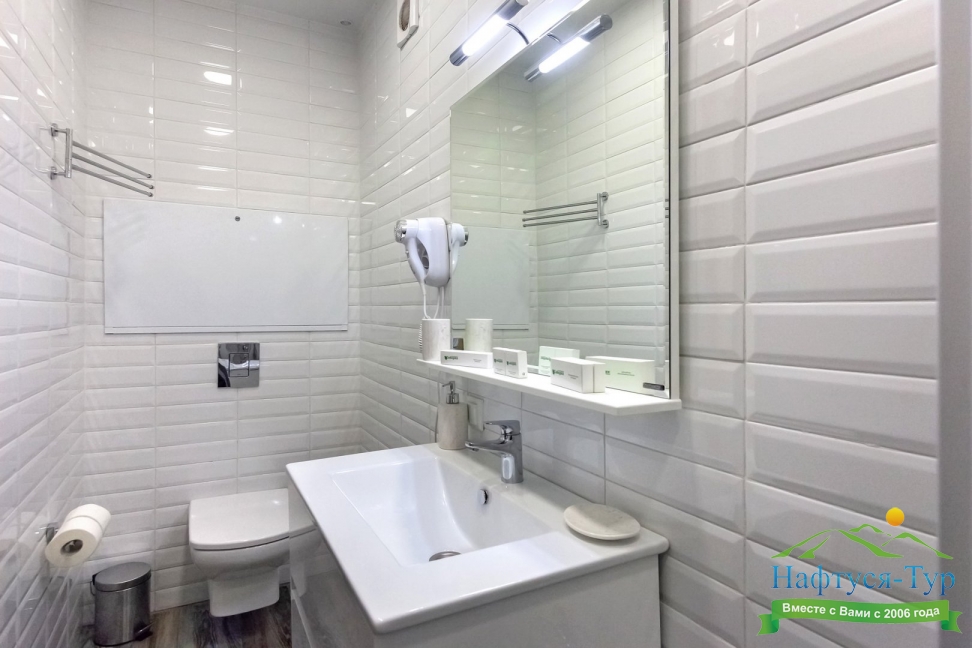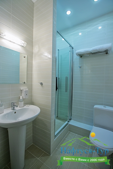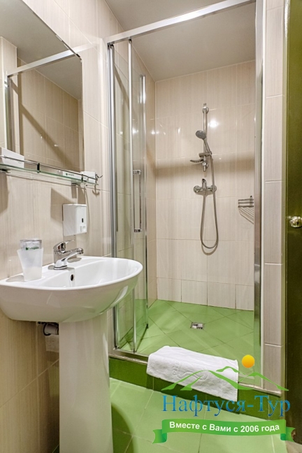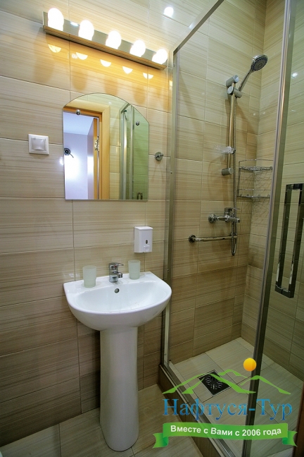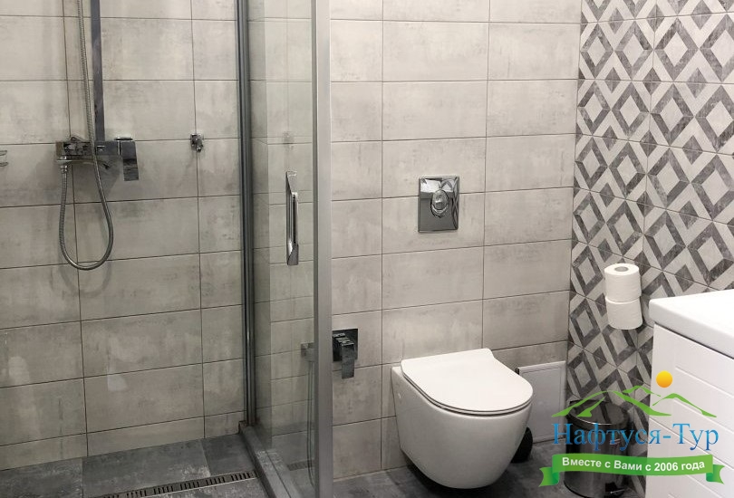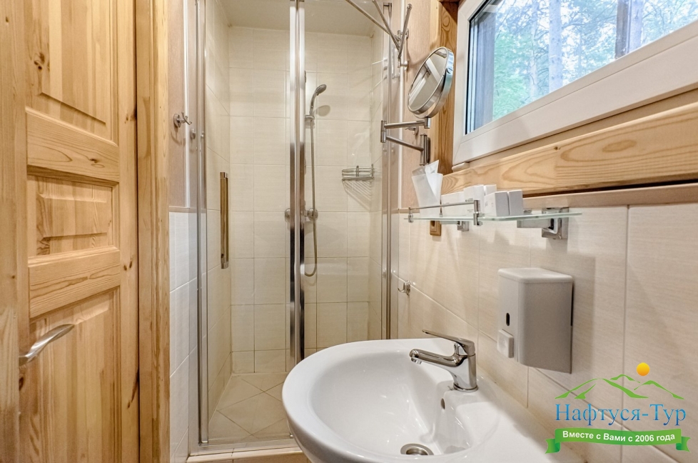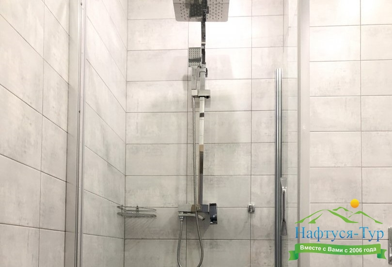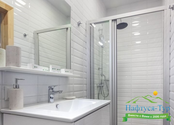 с душевой кабиной, тапочки, туалетные принадлежности, фен, халат