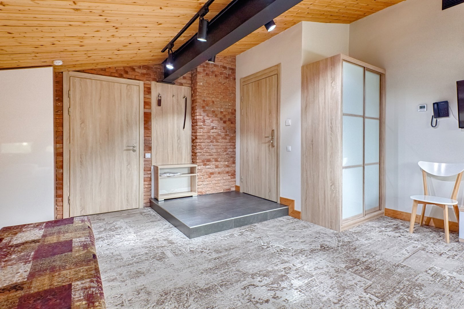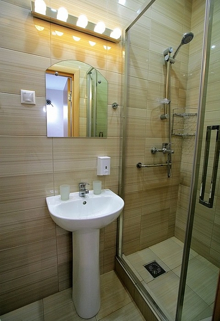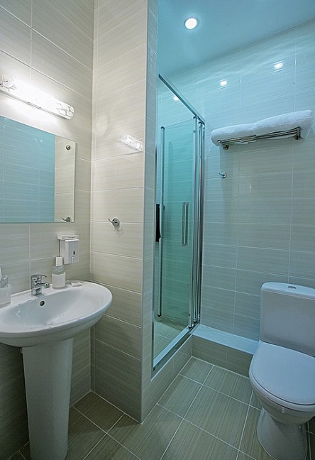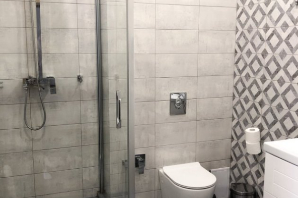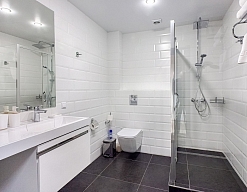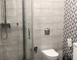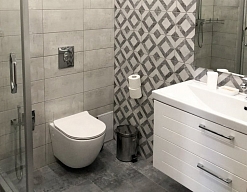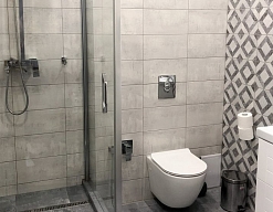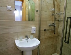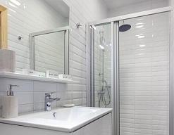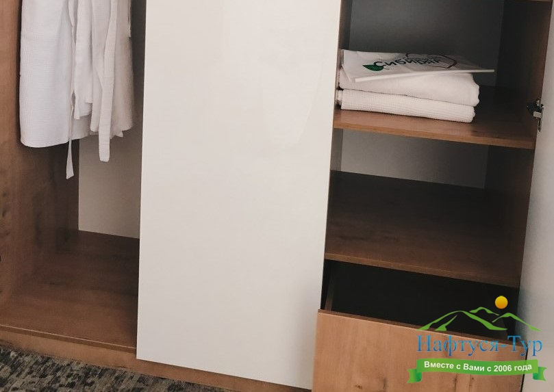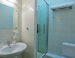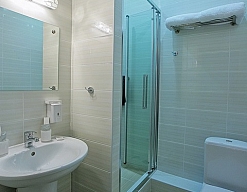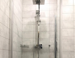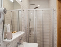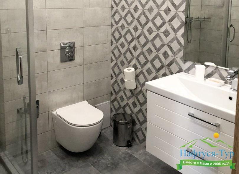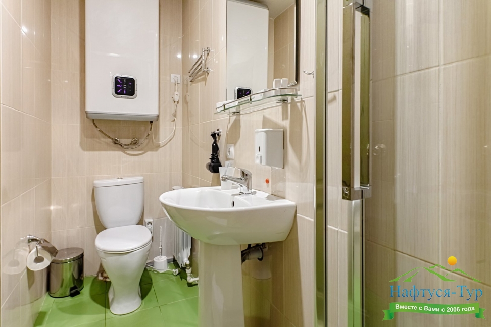с душевой кабиной, тапочки, туалетные принадлежности, фен, халат