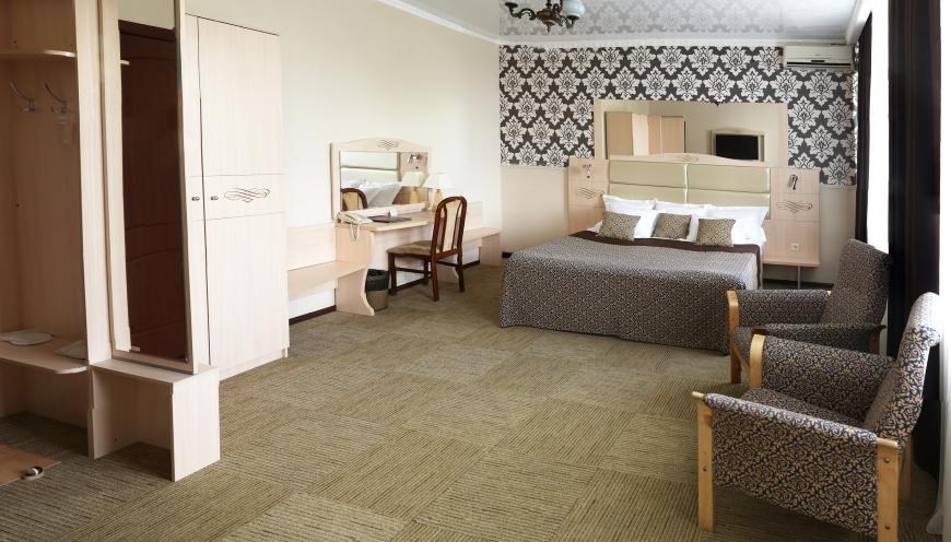 диван, зеркало, кровати односпальные /одна двуспальная кровать, прикроватные тумбочки, стол, стулья, шкаф