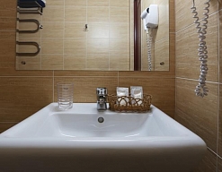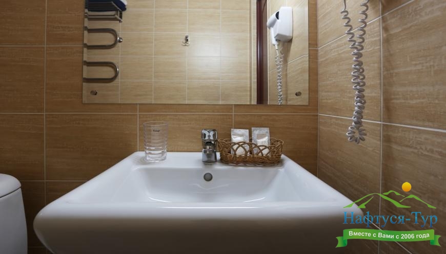 с душевой кабиной, тапочки, туалетные принадлежности, фен, халат
