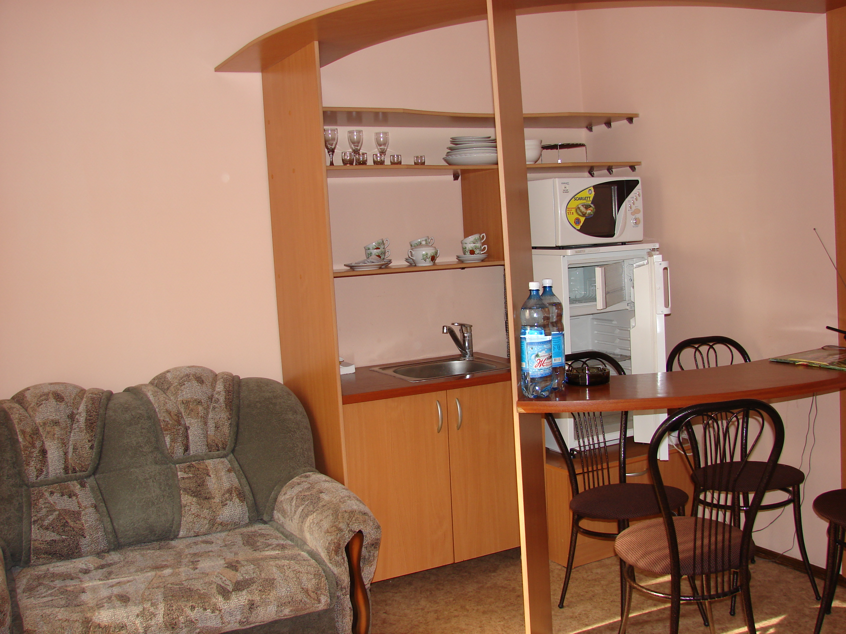 кондиционер, микроволновая печь, набор посуды, телевизор, телефон, холодильник, чайный набор посуды, электрочайник