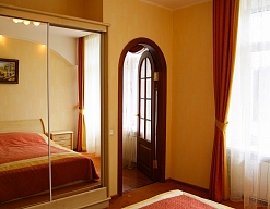 вешалка, зеркало, кресло-кровать, кровать двуспальная, прикроватная тумбочка, стол, стул, шкаф