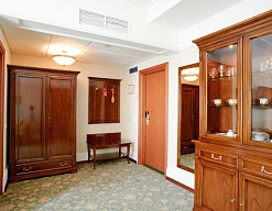 вешалка, диван, зеркало, кровать двуспальная, прикроватные тумбочки, стол, стулья, шкаф