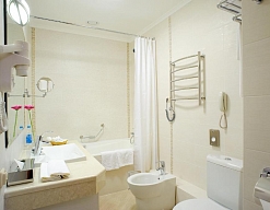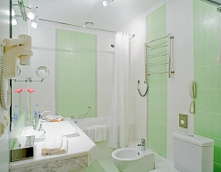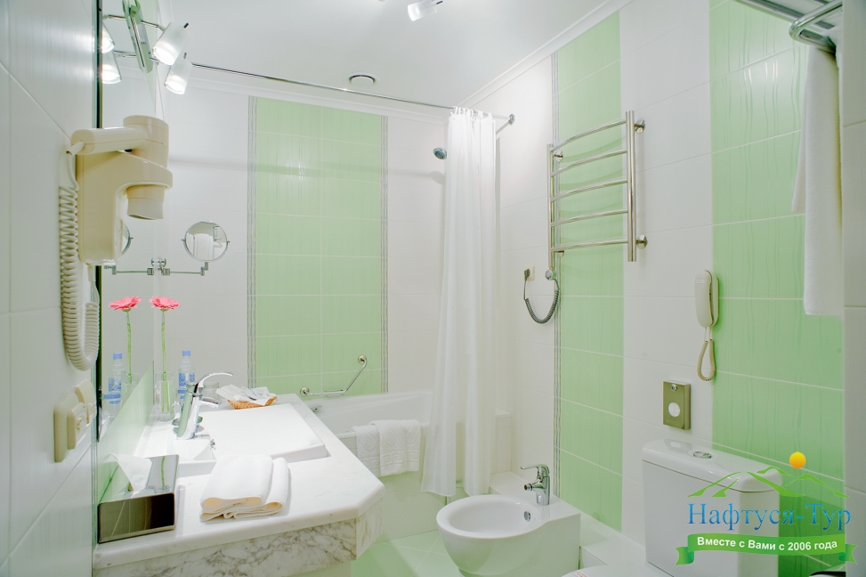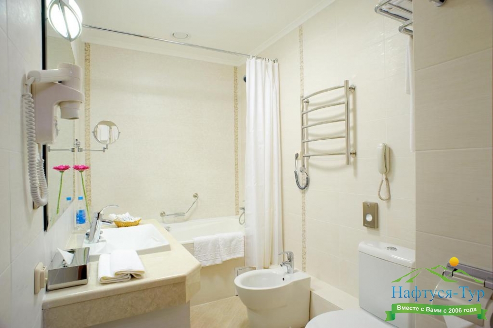с ванной, тапочки, туалетные принадлежности, фен, халат