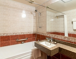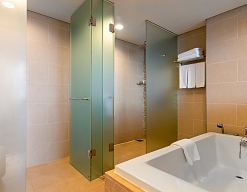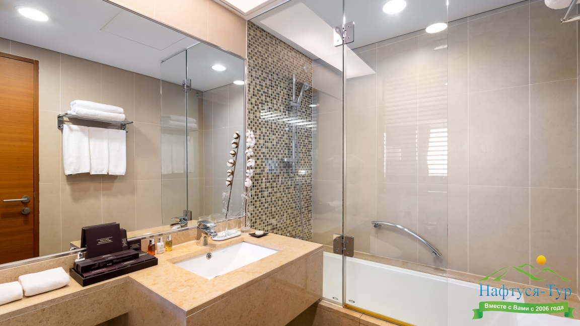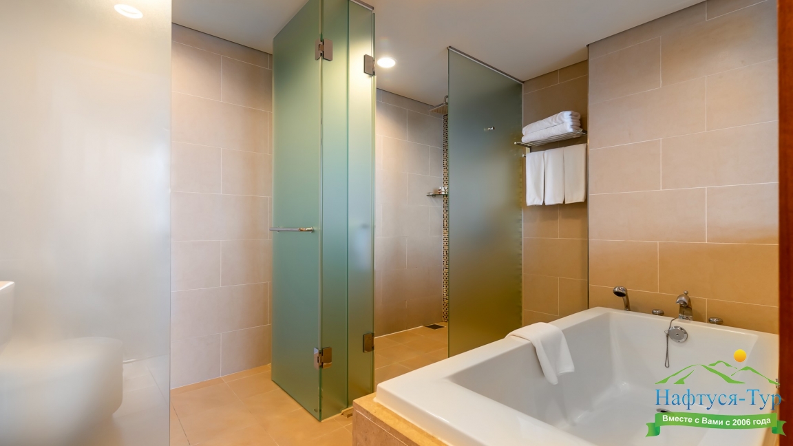 биде, с ванной и душевой кабиной, тапочки, туалетные принадлежности, фен, халат