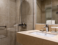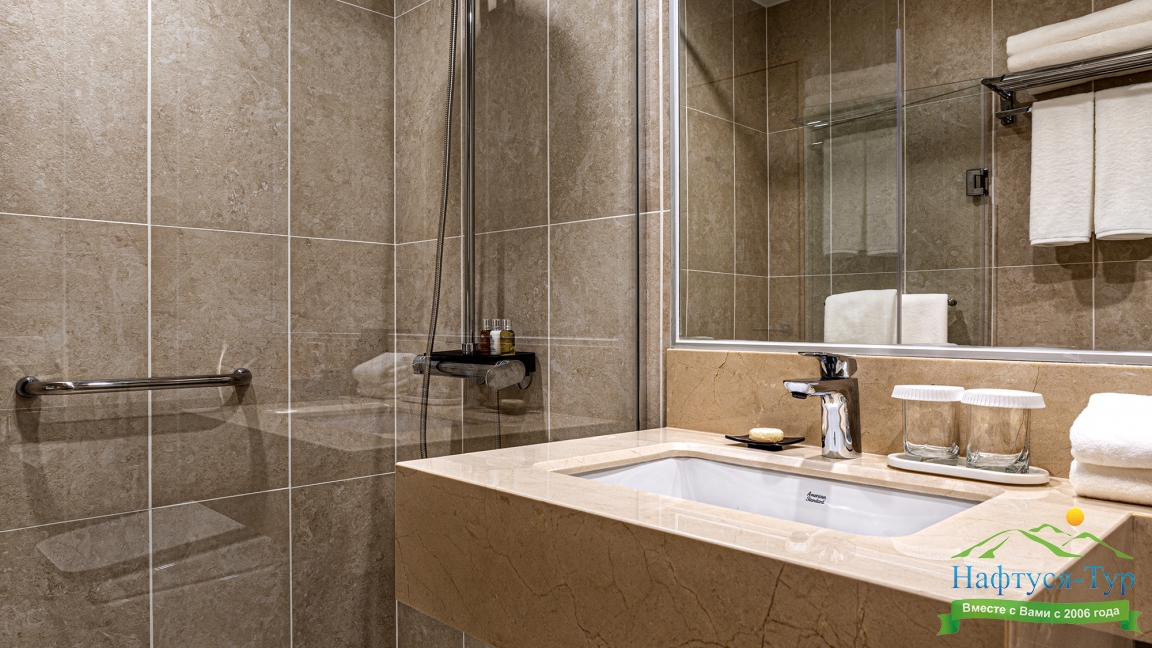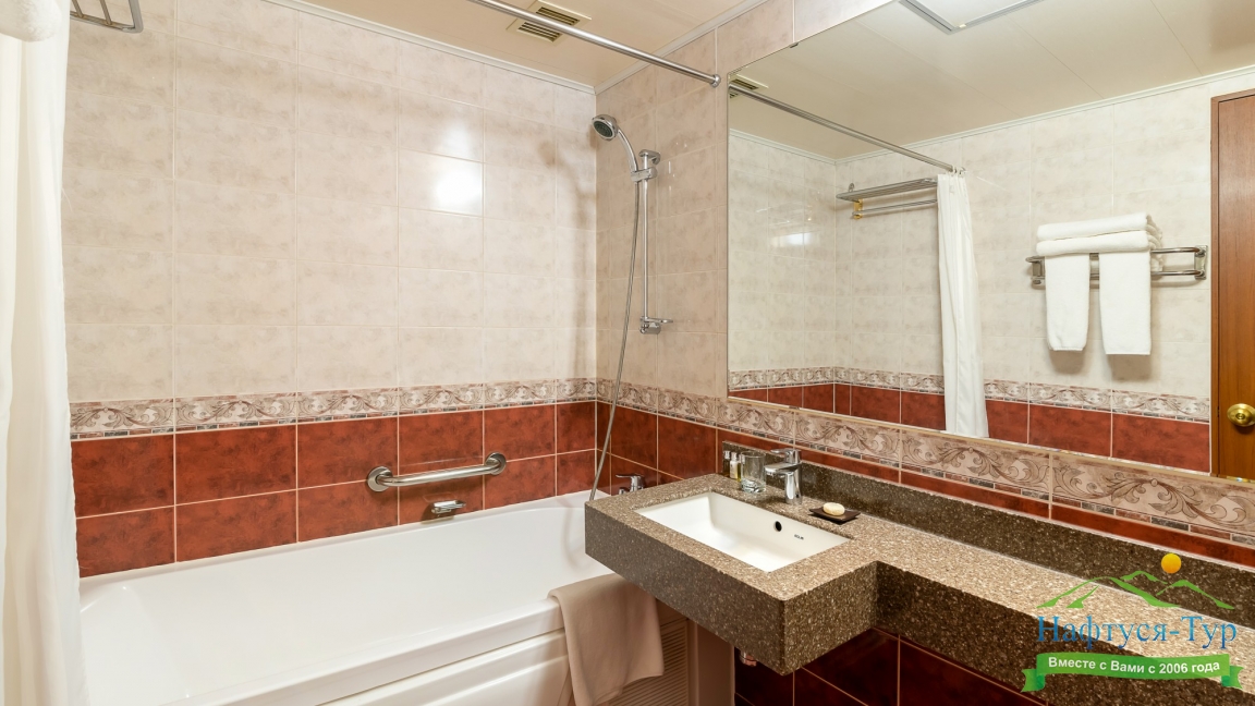 с ванной/душем, тапочки, туалетные принадлежности, фен, халат