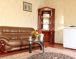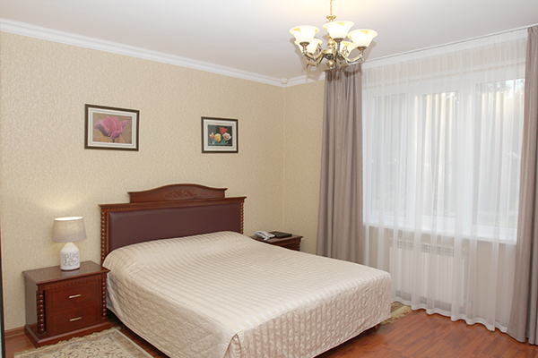 кровать двуспальная, мягкий уголок, прикроватные тумбочки, стол, стулья, шкаф, шкаф для посуды
