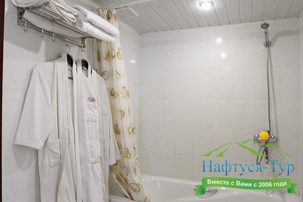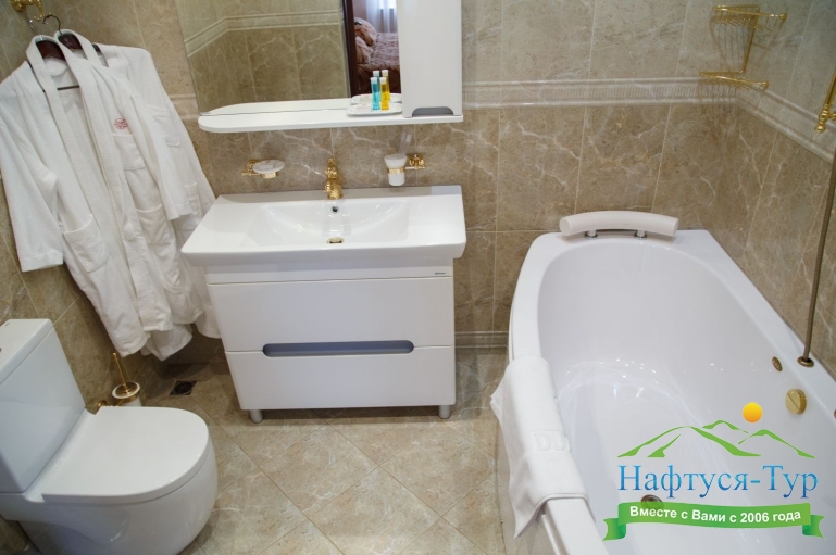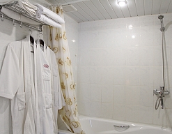 с ванной, тапочки, туалетные принадлежности, халат