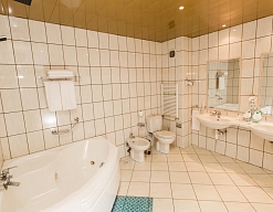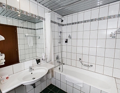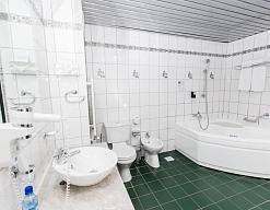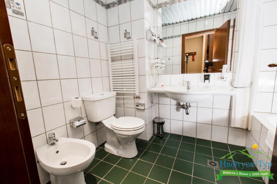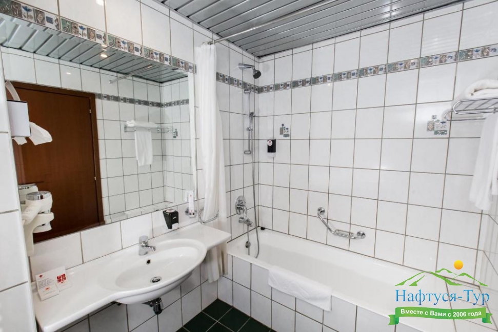 с ванной, тапочки, туалетные принадлежности, фен, халат