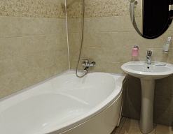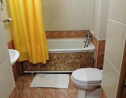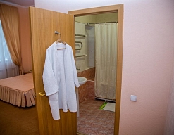 с ванной, тапочки, туалетные принадлежности, фен, халат