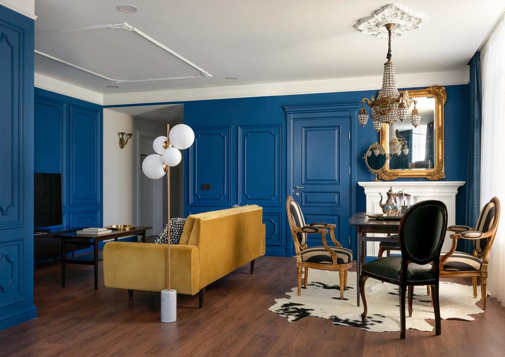 диван, кровать двуспальная, прикроватные тумбочки, стол, стул, шкаф