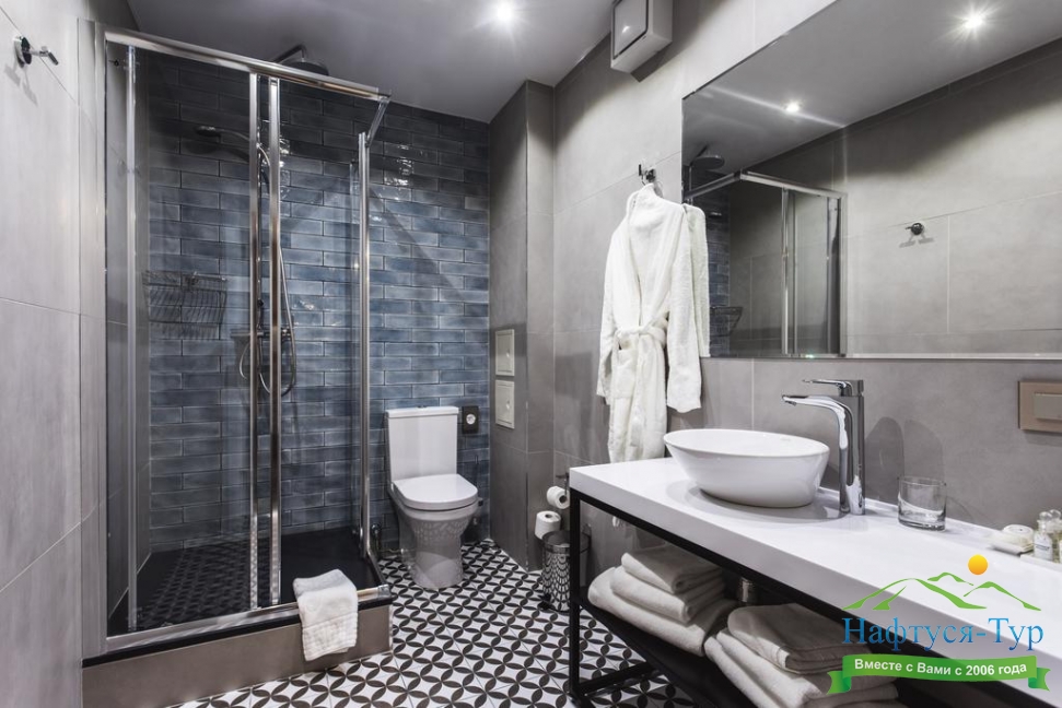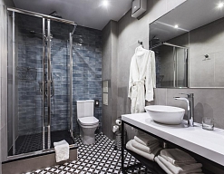 с душевой кабиной, тапочки, туалетные принадлежности, фен, халат