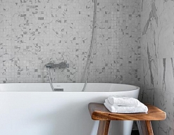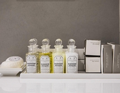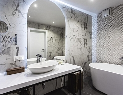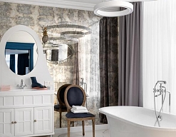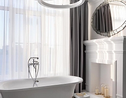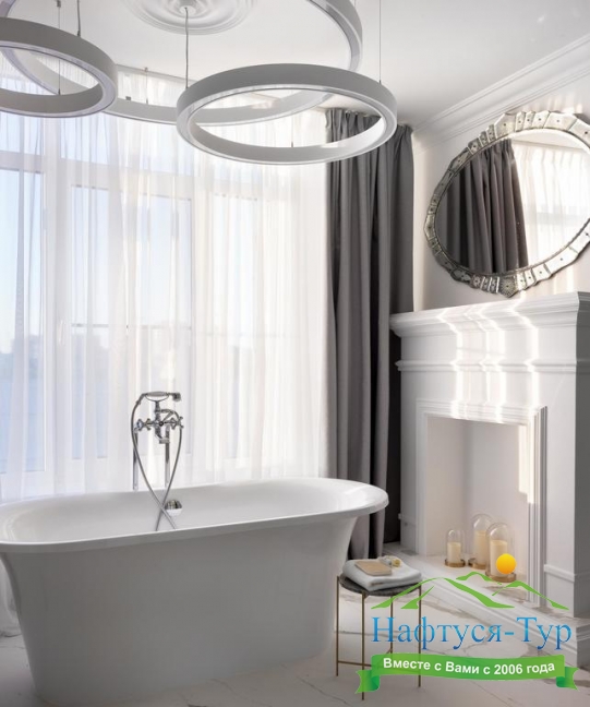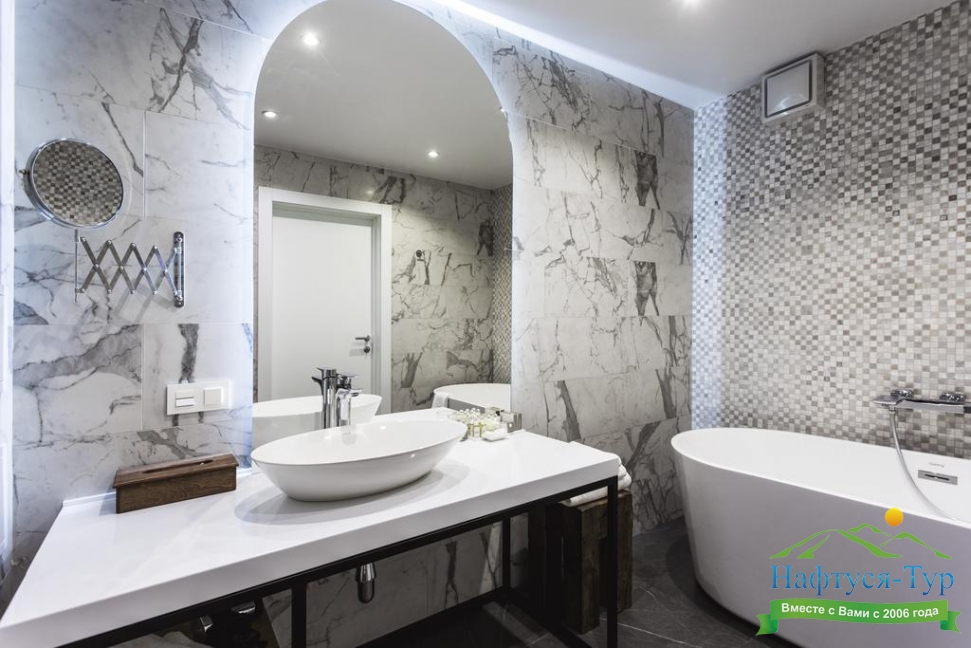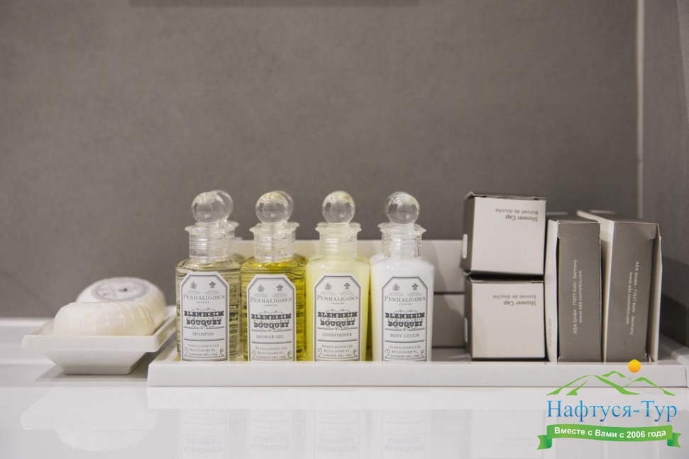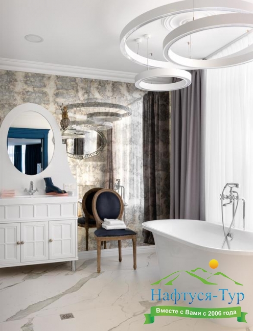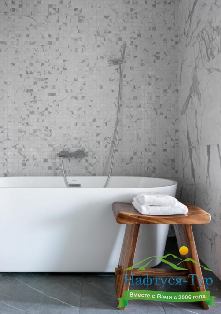 с ванной, тапочки, туалетные принадлежности, фен, халат