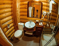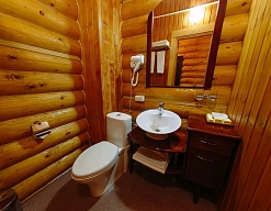 с душевой кабиной, тапочки, туалетные принадлежности, фен, халат